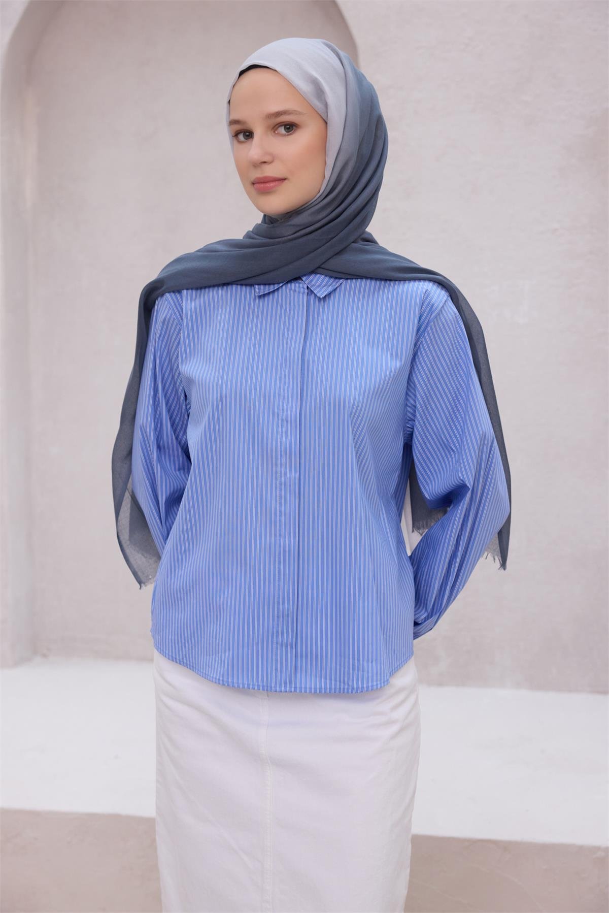 Görünümünüze sakin bir zarafet ekleyen tamamlayıcı bir dokunuştur. Minimal ve klasik çizgileri sevenler için şal, ölçülü bir şıklık sunar. Nötr tonlar tonları, minimal ve klasik çizgileri rahatça tamamlar. Özel günlerde sevdiklerinize sade bir şıklık sunar. Naif desen detayları modele karakter ve akış kazandırır.