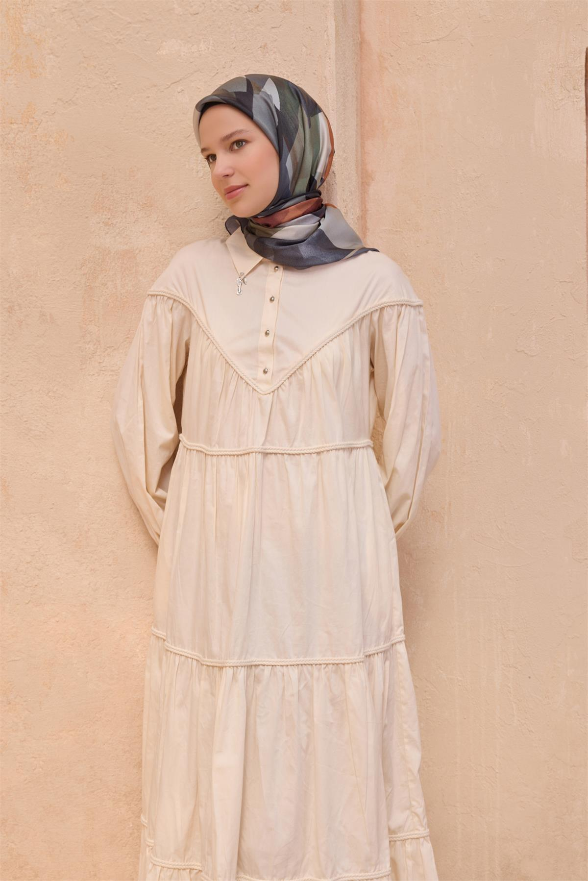 Görünümünüze sakin bir zarafet ekleyen tamamlayıcı bir dokunuştur. Mevsim geçişlerinde katmanlı kombinlere pratik bir destek sağlar. Dengeli tutuşu ve pürüzsüz dokusuyla bu eşarp, kaliteli kumaş ve özenli doku uyumunu zarifçe yansıtır. Uzun ömürlü kullanım için hassas bakım önerilir. Yoğun tempo günlerinde eşarp, görünümü sakin ve düzenli tutar. Naif desen vurgusu, sade çizgiye incelikli bir dinamizm ekler.