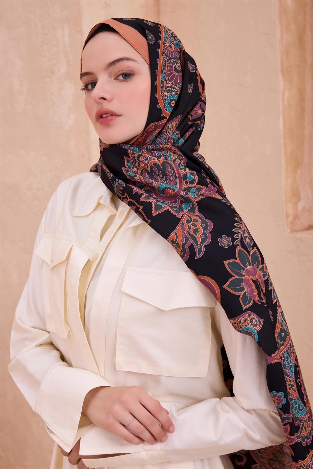 Stilinizi zahmetsizce tamamlayan zamansız bir parçadır. Özenli etnik desen işlemesi görsel bütünlüğe ritim katar. Siyah turuncu paleti günlük stile sakin ve güçlü bir etki katar. Günlük şehir stilinden özel davetlere uzanan kombinlerde şal olarak rahatça değerlendirilebilir. Mevsim geçişlerinde katmanlı kombinlere pratik bir destek sağlar.
