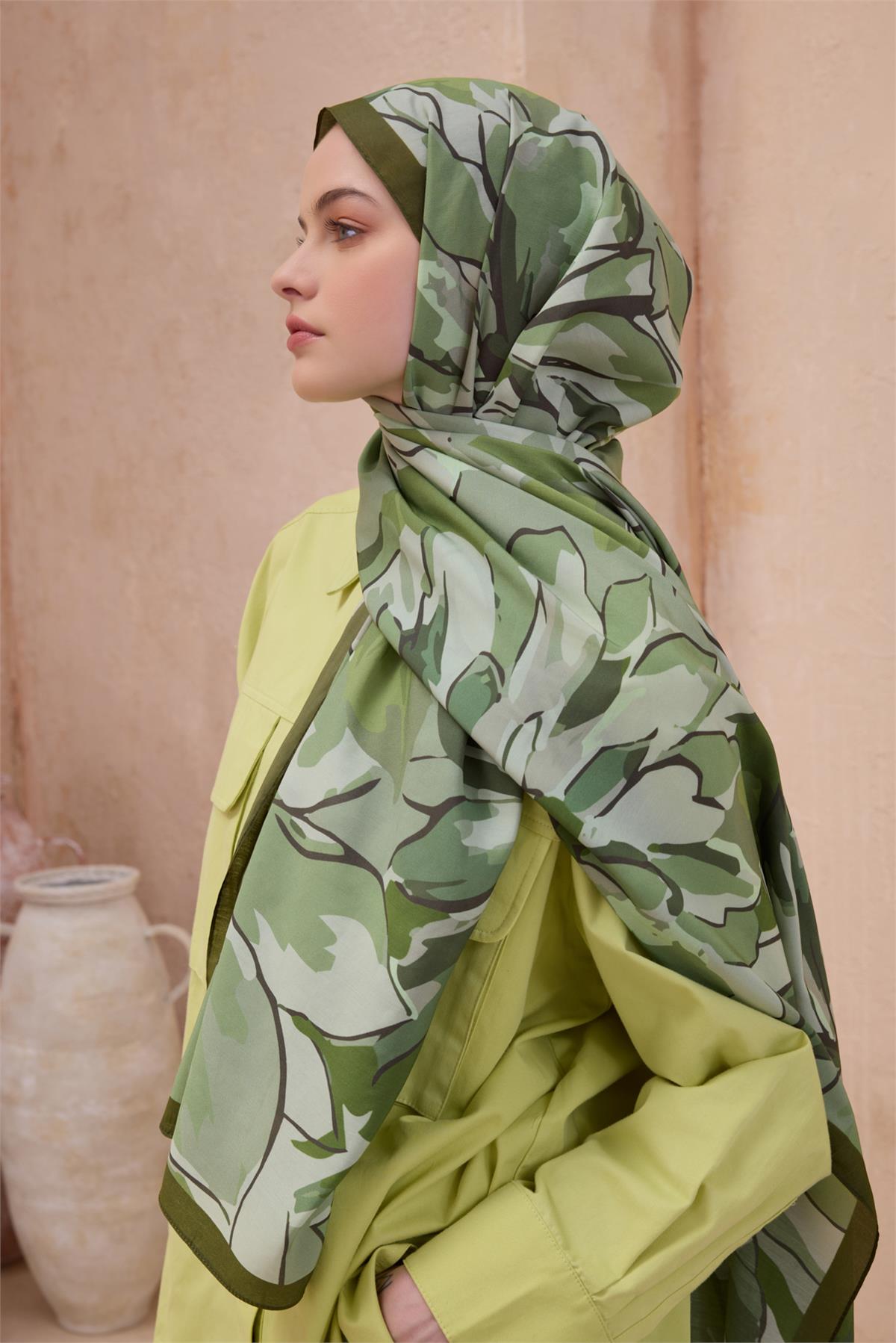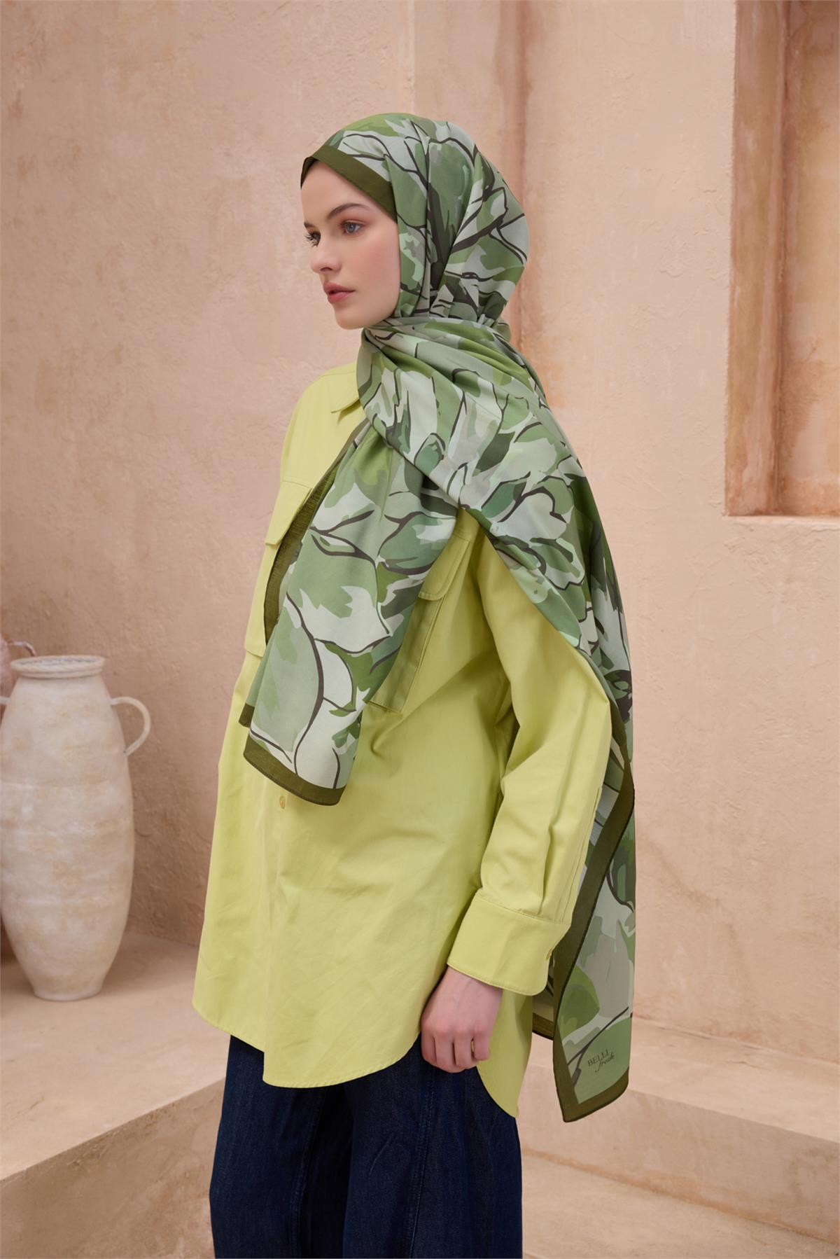 Çiçek desen detayları modele karakter ve akış kazandırır. Görünümünüze sakin bir zarafet ekleyen tamamlayıcı bir dokunuştur. Haki gamı, ofis ve şehir stiline kolayca entegre olur. Serin akşamlarda ince katmanlar üzerinde zarif bir tamamlayıcıdır. Kapsül dolaplara uyumuyla uzun süre değerini koruyan bir seçimdir. Kumaş yapısını korumak için yoğun sürtünmeden kaçınılmalıdır.