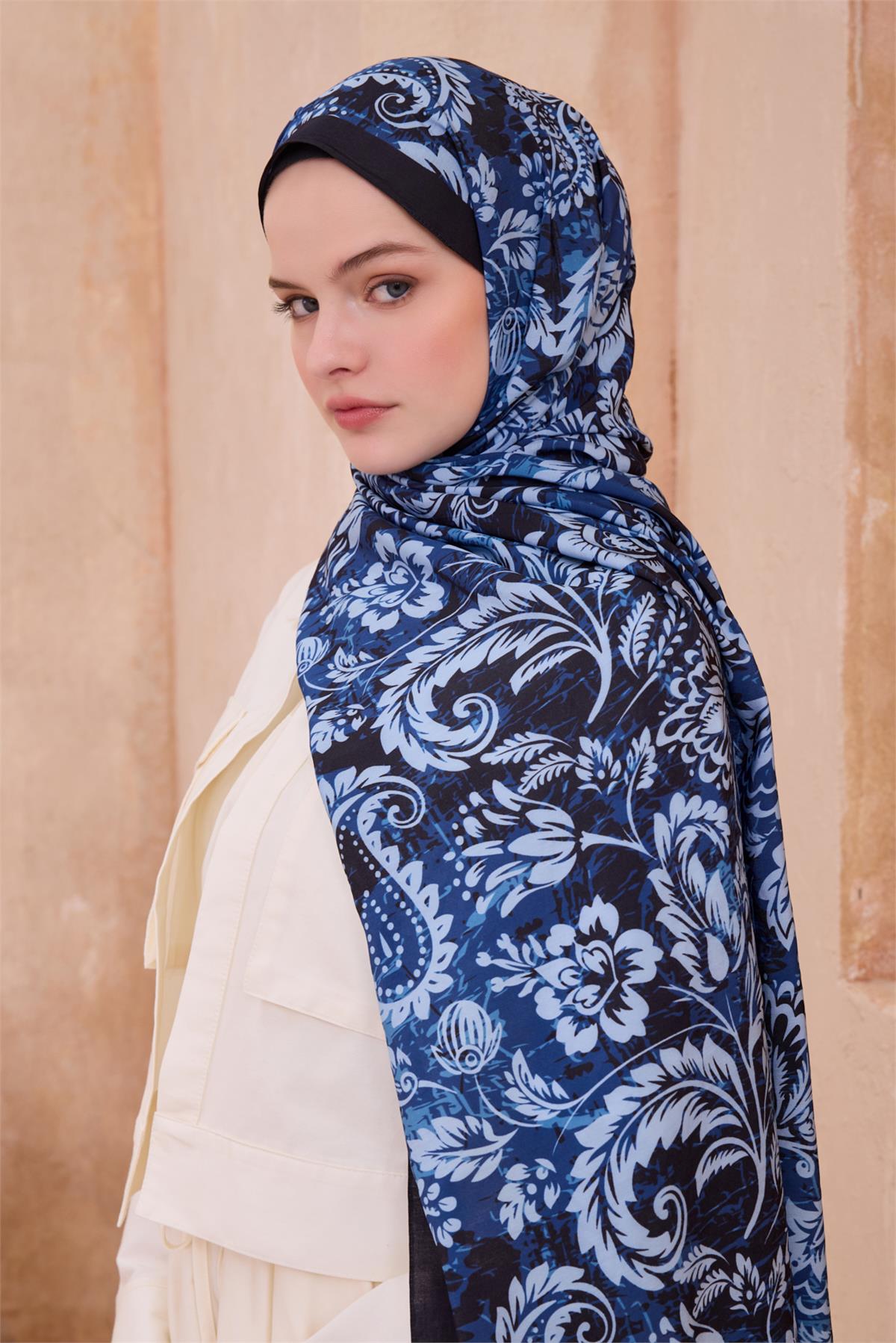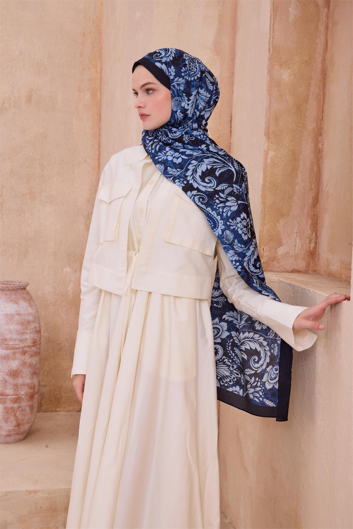 Stilinizi zahmetsizce tamamlayan zamansız bir parçadır. Lacivert mavi tonları farklı kombinlerle kusursuz bir uyum yakalar. Minimal ve klasik çizgileri sevenler için şal, ölçülü bir şıklık sunar. Seyahat ve hafta sonu planlarında hafifliğiyle öne çıkar. Akıcı görünümü ve hafif hissiyle bu şal, kaliteli kumaş ve özenli doku yapısından güç alır. Özenli çiçek desen işlemesi görsel bütünlüğe ritim katar.