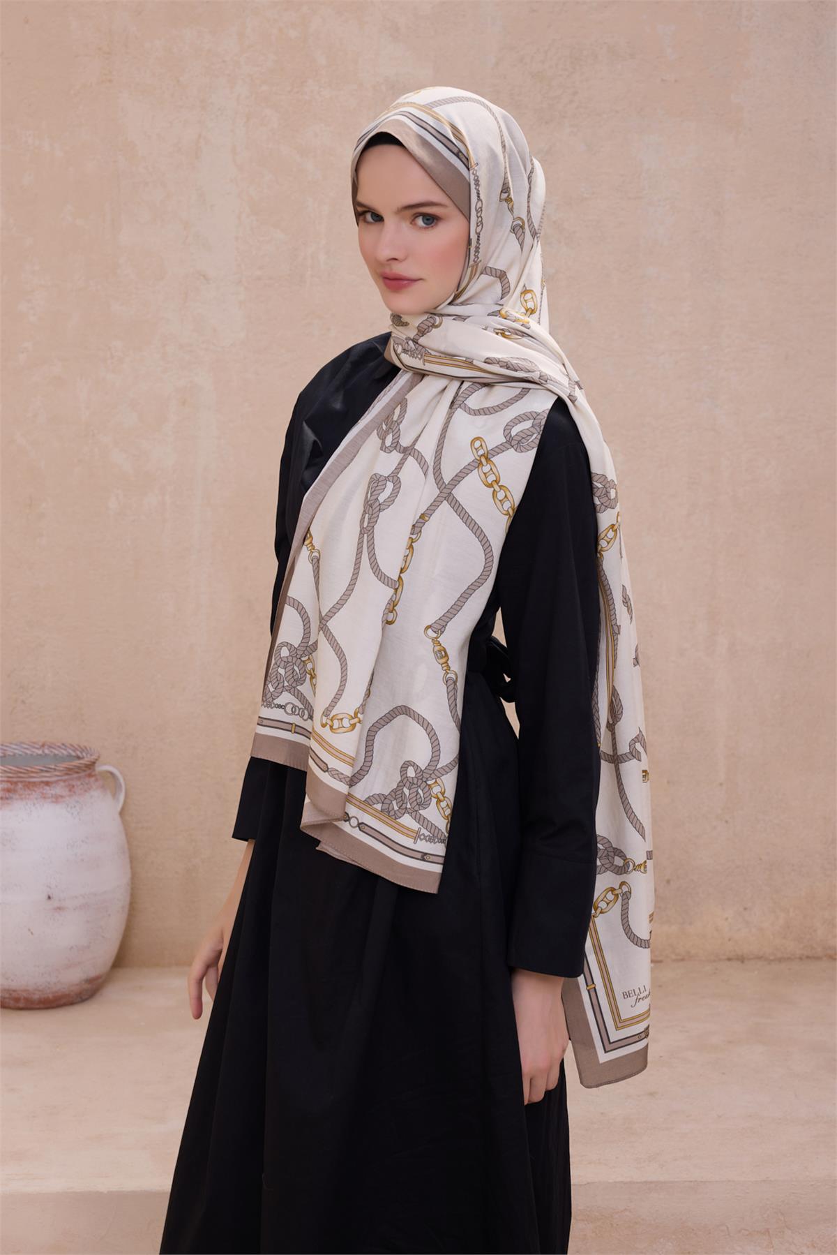 Zincir desen dokunuşu parçanın seçkin duruşunu destekler. Konfor ve zarafeti aynı potada toplayan bu şal, kaliteli kumaş ve özenli doku birlikteliğiyle öne çıkar. Uzun ömürlü kullanım için hassas bakım önerilir. Krem-bej tonları, minimal ve klasik çizgileri rahatça tamamlar. Serin akşamlarda ince katmanlar üzerinde zarif bir tamamlayıcıdır. Şal tercih edenler için formunu koruyan dengeli bir alternatif oluşturur.