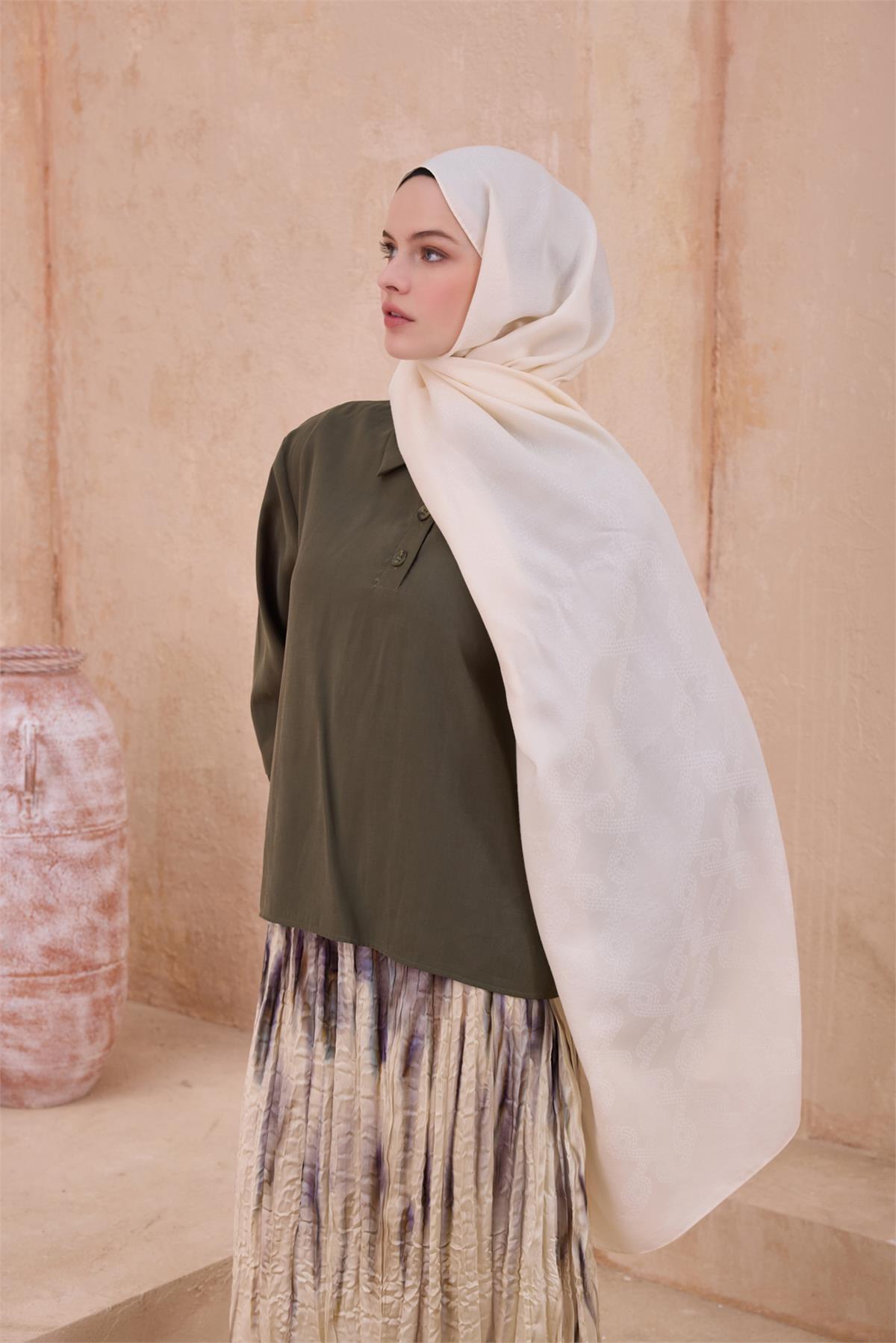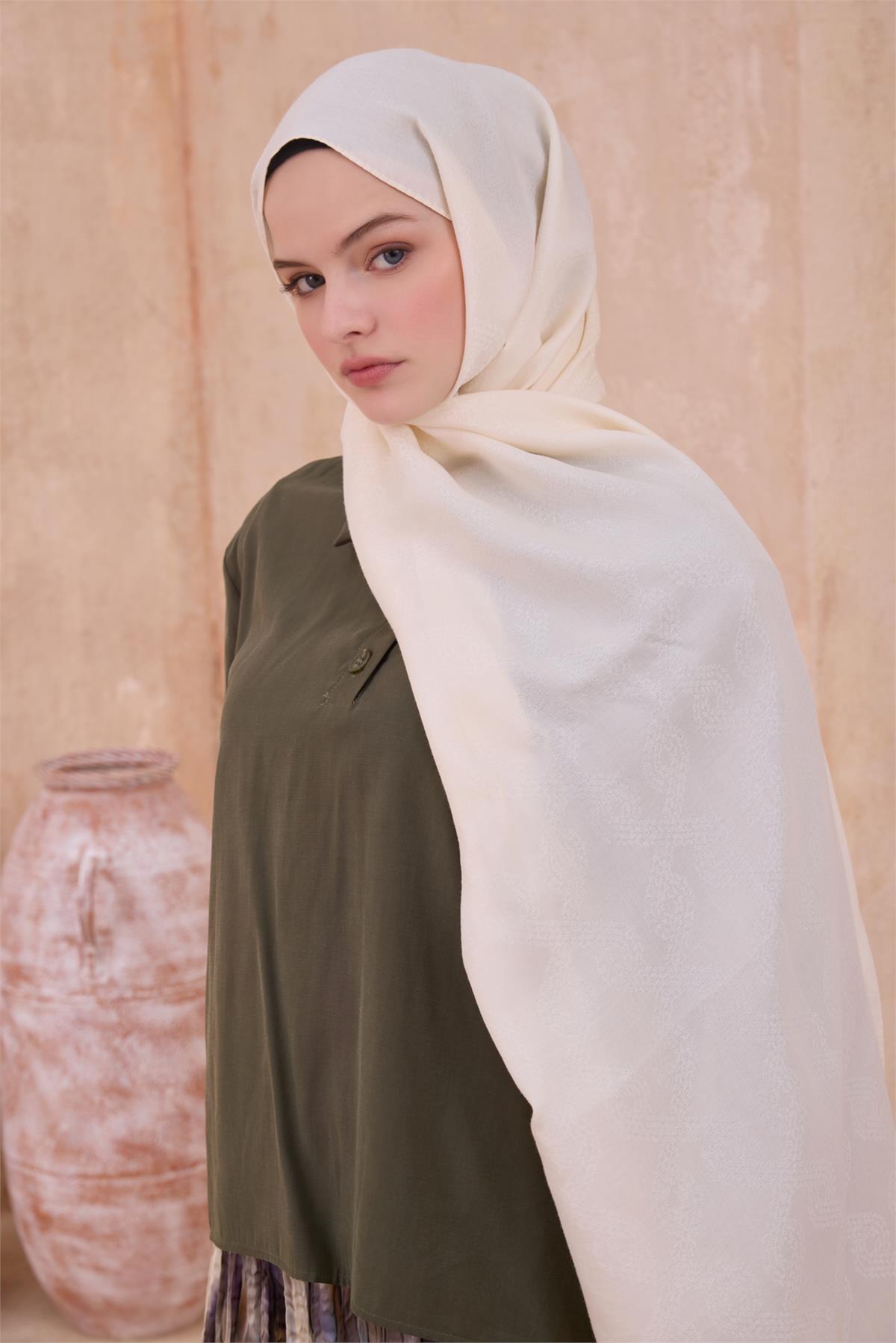 Nazik yıkama ve düz zemin kurutma tavsiye edilir. Şal tercih edenler için formunu koruyan dengeli bir alternatif oluşturur. Zincir halka yaklaşımı tasarımın özgün kimliğini öne çıkarır. Serin akşamlarda ince katmanlar üzerinde zarif bir tamamlayıcıdır. Dengeli tutuşu ve pürüzsüz dokusuyla bu şal, kaliteli kumaş ve özenli doku uyumunu zarifçe yansıtır.