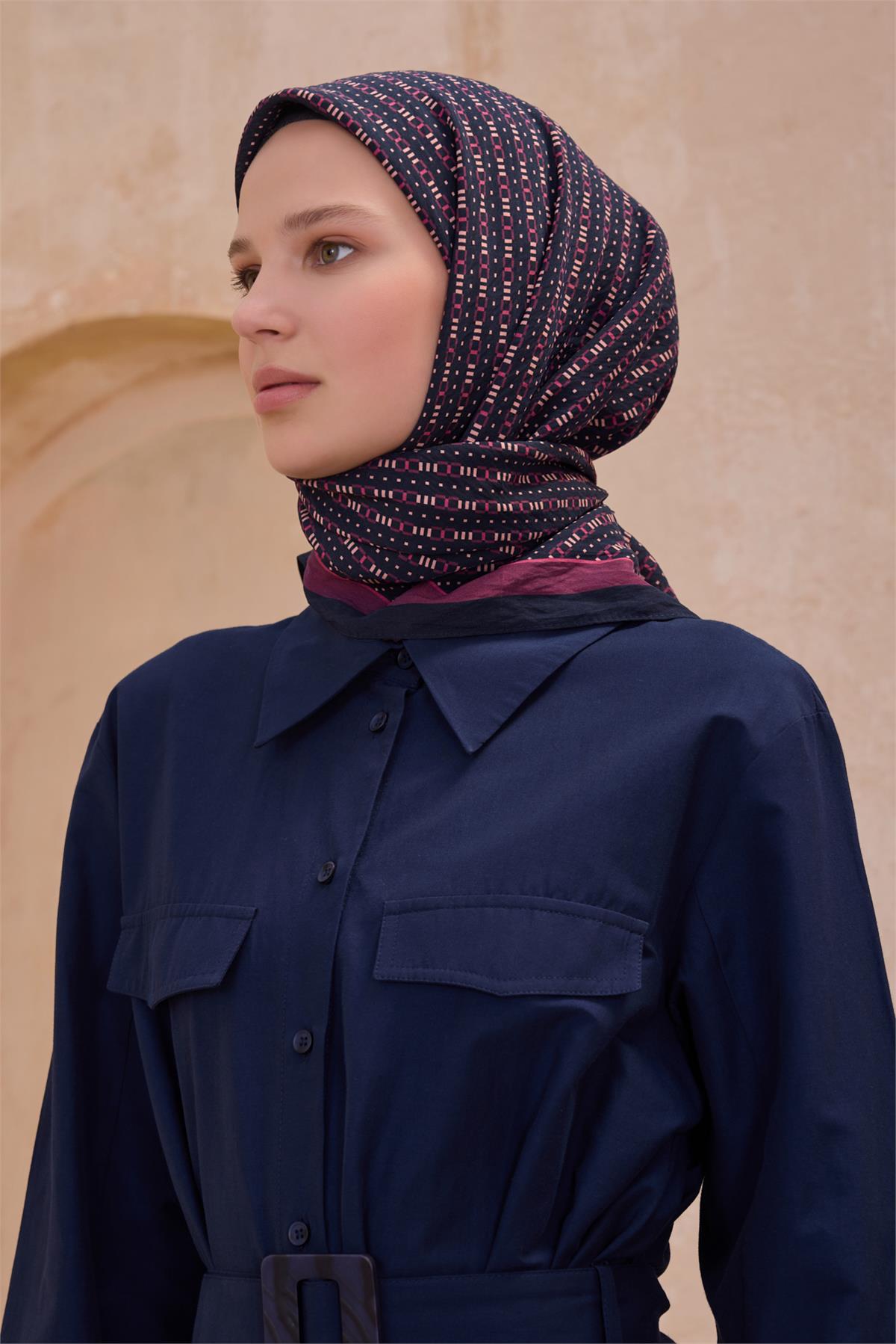 Uzun ömürlü kullanım için hassas bakım önerilir. Özenli geometrik desen işlemesi görsel bütünlüğe ritim katar. Bordo paleti günlük stile sakin ve güçlü bir etki katar. Günlük şehir stilinden özel davetlere uzanan kombinlerde eşarp olarak rahatça değerlendirilebilir. Zarif bir hediye alternatifi olarak da düşünülebilir.