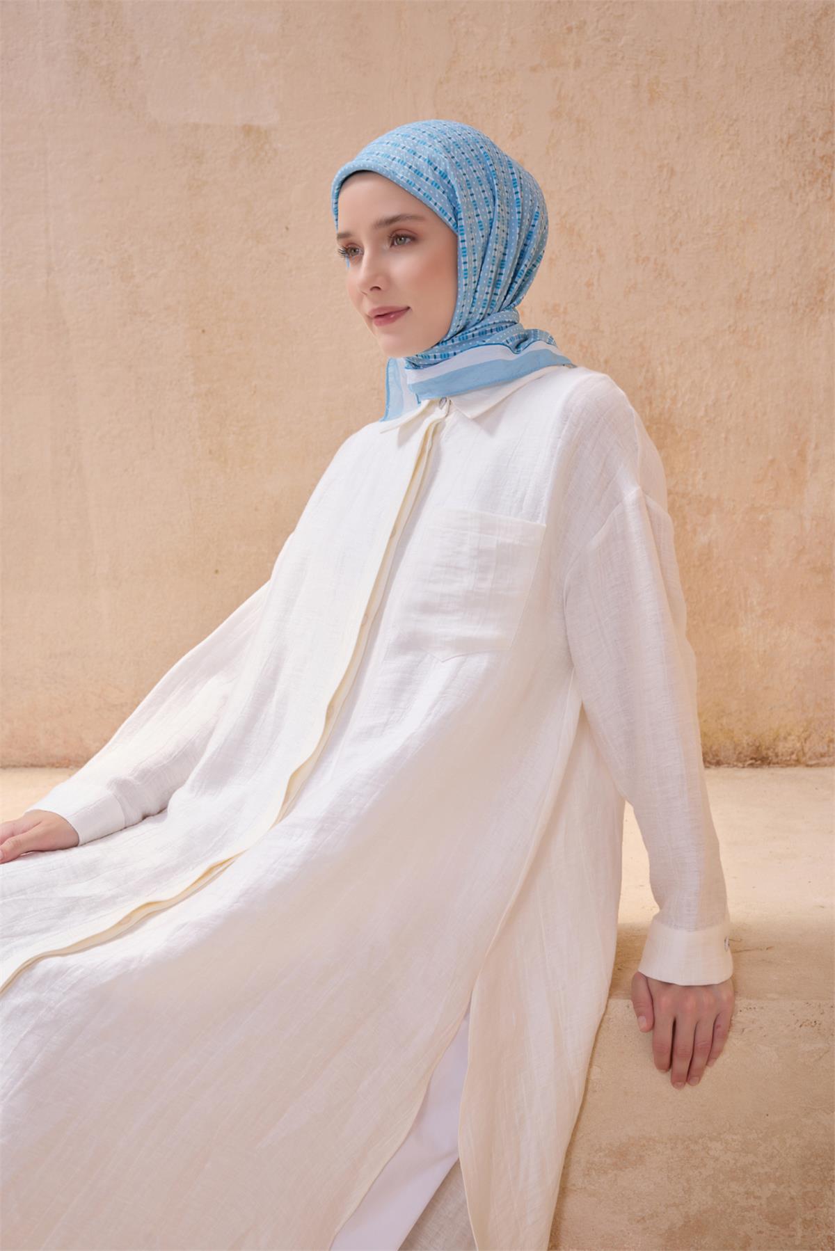 Geometrik desen vurgusu, sade çizgiye incelikli bir dinamizm ekler. Modern mavi rengi zamansız ve dengeli bir görünüm sunar. Özel günlerde sevdiklerinize sade bir şıklık sunar. Uzun ömürlü kullanım için hassas bakım önerilir. Akıcı görünümü ve hafif hissiyle bu eşarp, geometrik desen ve özenli doku yapısından güç alır. Mevsim geçişlerinde katmanlı kombinlere pratik bir destek sağlar.