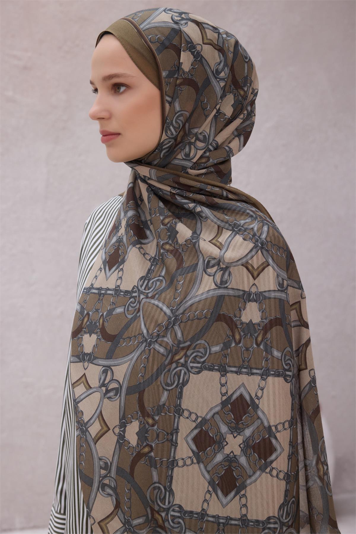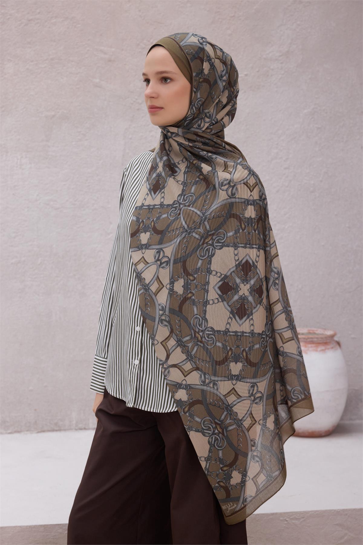 Nötr tonlar gamı, ofis ve şehir stiline kolayca entegre olur. Naif desen dokunuşu parçanın seçkin duruşunu destekler. Nazik yıkama ve düz zemin kurutma tavsiye edilir. Stilinizi zahmetsizce tamamlayan zamansız bir parçadır. Özel günlerde sevdiklerinize sade bir şıklık sunar. Kaliteli kumaş yapısı, özenli doku dokuyla birleşerek bu şalna modern bir ifade kazandırır.