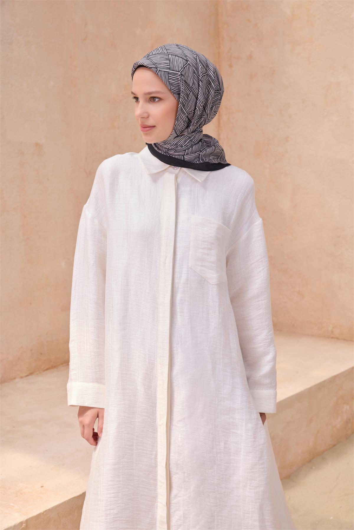 Yoğun tempo günlerinde eşarp, görünümü sakin ve düzenli tutar. Gün boyu konfor arayanlar için hafif ve düzenli bir duruş sergiler. Lacivert tonları farklı kombinlerle kusursuz bir uyum yakalar. Konfor ve zarafeti aynı potada toplayan bu eşarp, geometrik desen ve özenli doku birlikteliğiyle öne çıkar. Geometrik desen vurgusu, sade çizgiye incelikli bir dinamizm ekler.