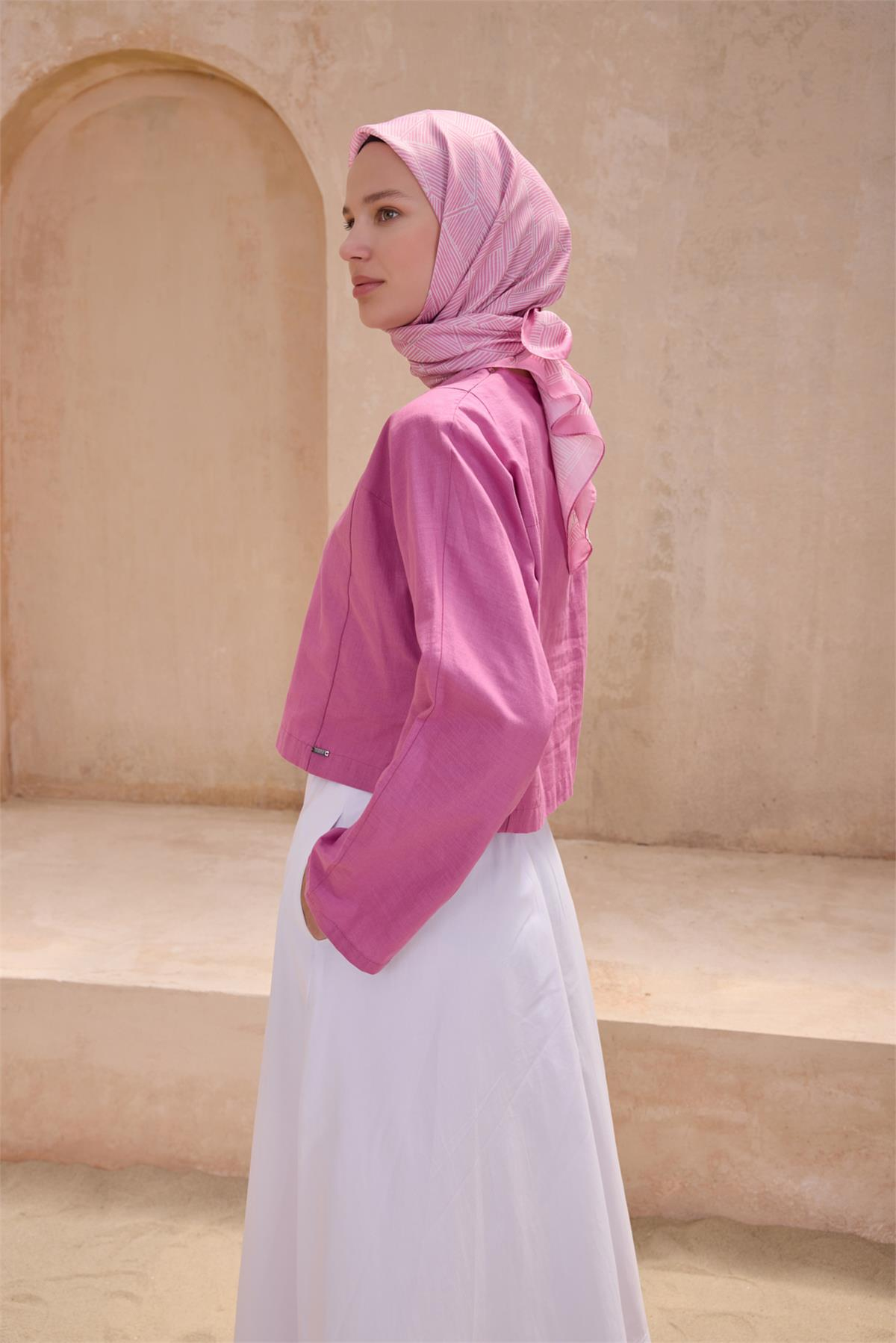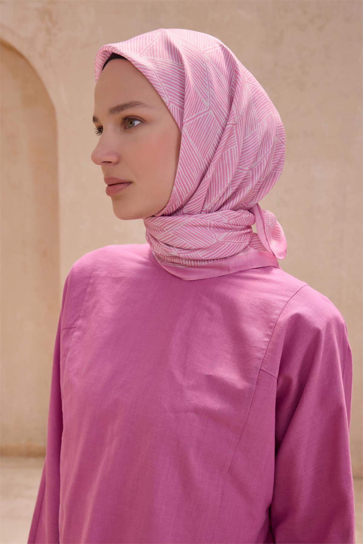 Günlük şehir stilinden özel davetlere uzanan kombinlerde eşarp olarak rahatça değerlendirilebilir. Her mevsimde değerlendirilebilecek dengeli ve şık bir çözümdür. Modern pembe rengi zamansız ve dengeli bir görünüm sunar. Geometrik desen dokunuşu parçanın seçkin duruşunu destekler. Zarif bir hediye alternatifi olarak da düşünülebilir. Seyahat ve hafta sonu planlarında hafifliğiyle öne çıkar.