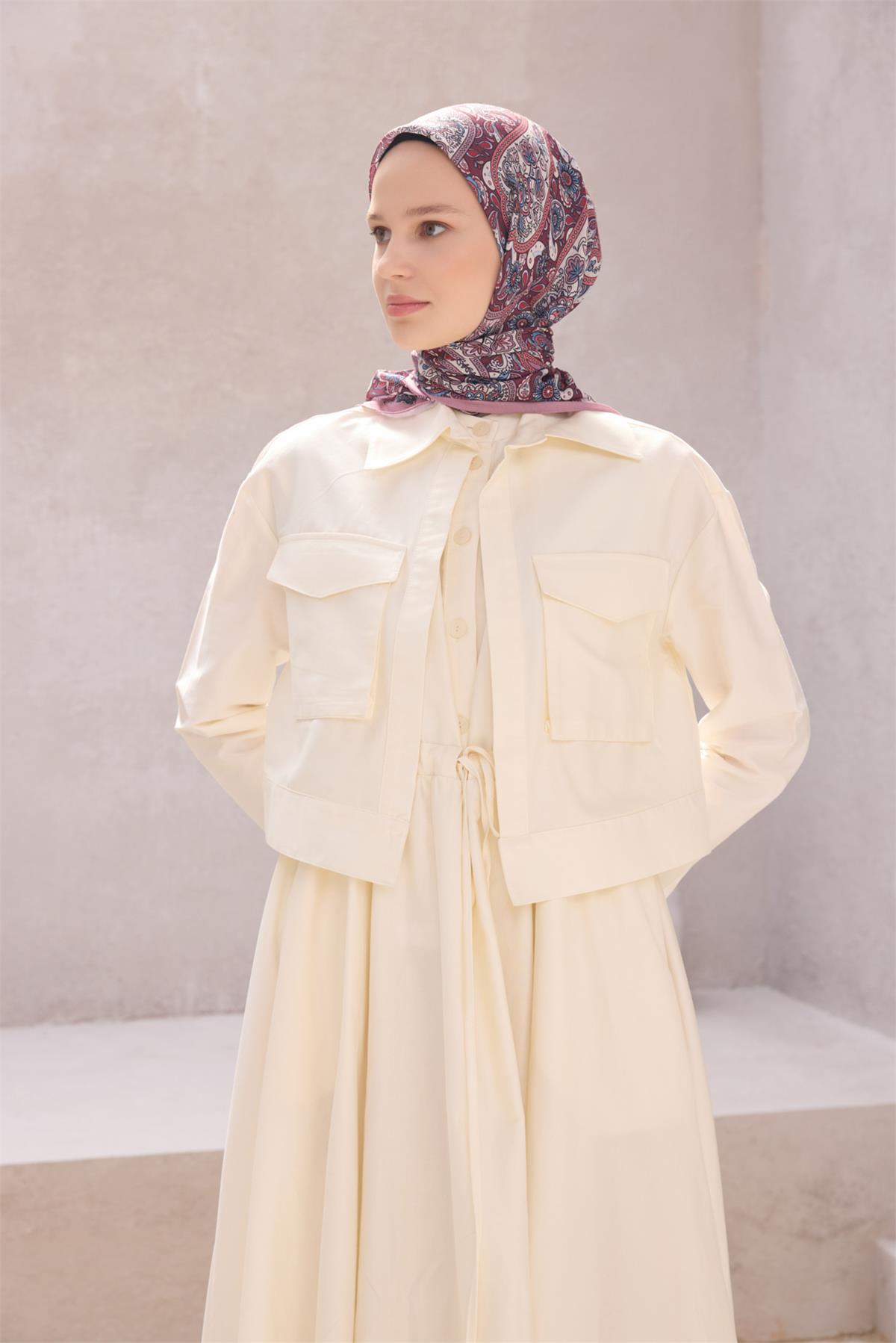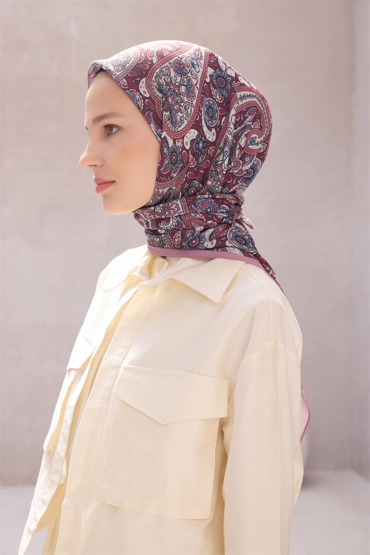 Etnik desen yaklaşımı tasarımın özgün kimliğini öne çıkarır. Serin akşamlarda ince katmanlar üzerinde zarif bir tamamlayıcıdır. Kaliteli kumaş temelli yapısı ve özenli doku karakteriyle bu eşarp, gün boyu düzenli bir duruş sunar. Her mevsimde değerlendirilebilecek dengeli ve şık bir çözümdür. Nazik yıkama ve düz zemin kurutma tavsiye edilir. Günlük şehir stilinden özel davetlere uzanan kombinlerde eşarp olarak rahatça değerlendirilebilir.