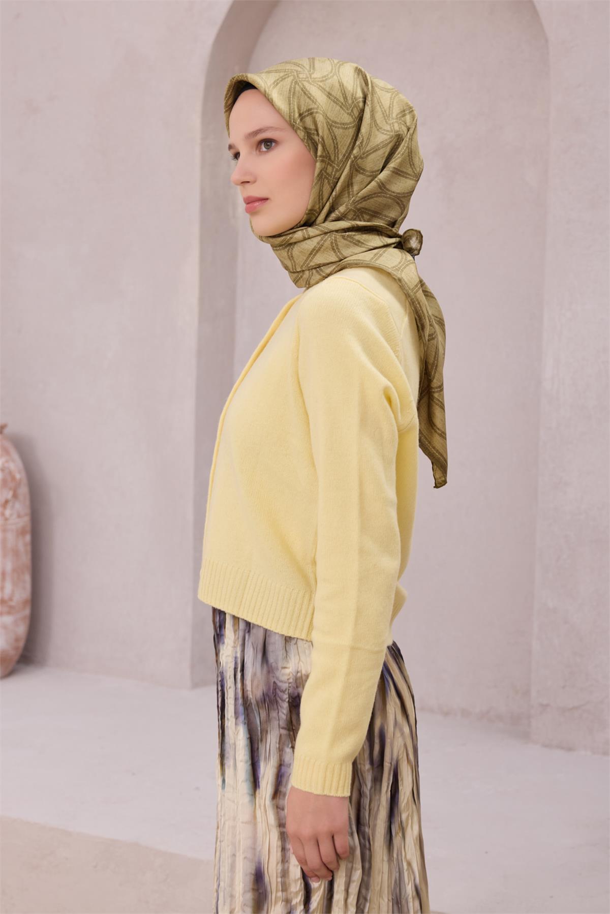 Modern çizgileriyle geometi̇k desen deseni, %100 saf i̇pek eşarpya haki̇ tonlarında zarif bir duruş kazandırıyor. Kombinlerinize sofistike bir dokunuş katarken doğal parlaklığıyla öne çıkar. Yumuşak dokusuyla gün boyu konfor sunar.